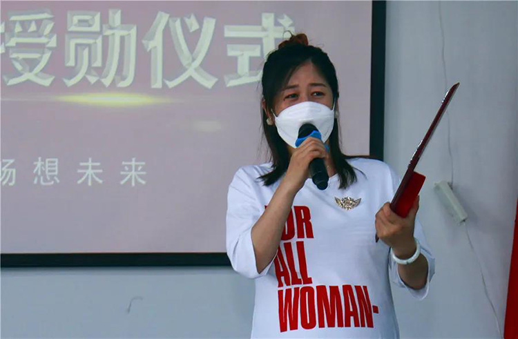 乾港集團董事長安總和集團網(wǎng)絡部總經(jīng)理丁總,分別為工作滿五年的元老授予特別定制的勛章,相信這份榮耀將伴隨她們?nèi)〉酶蟮某煽儯诟髯詬徫恢杏懈玫耐黄?。緊接著乾港集團各部門的小伙伴們也為元老們送上了鮮花、祝福和精心挑選的禮物。